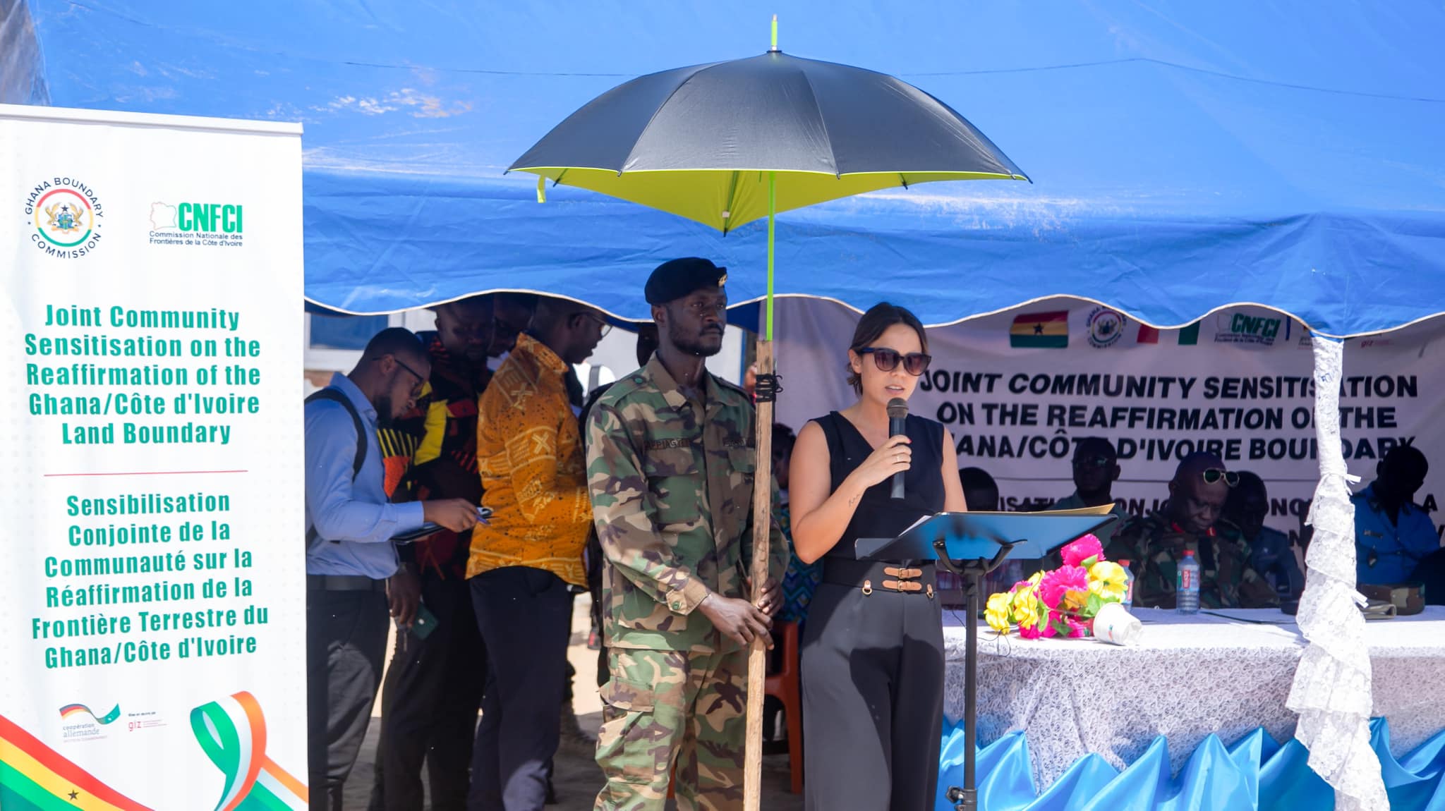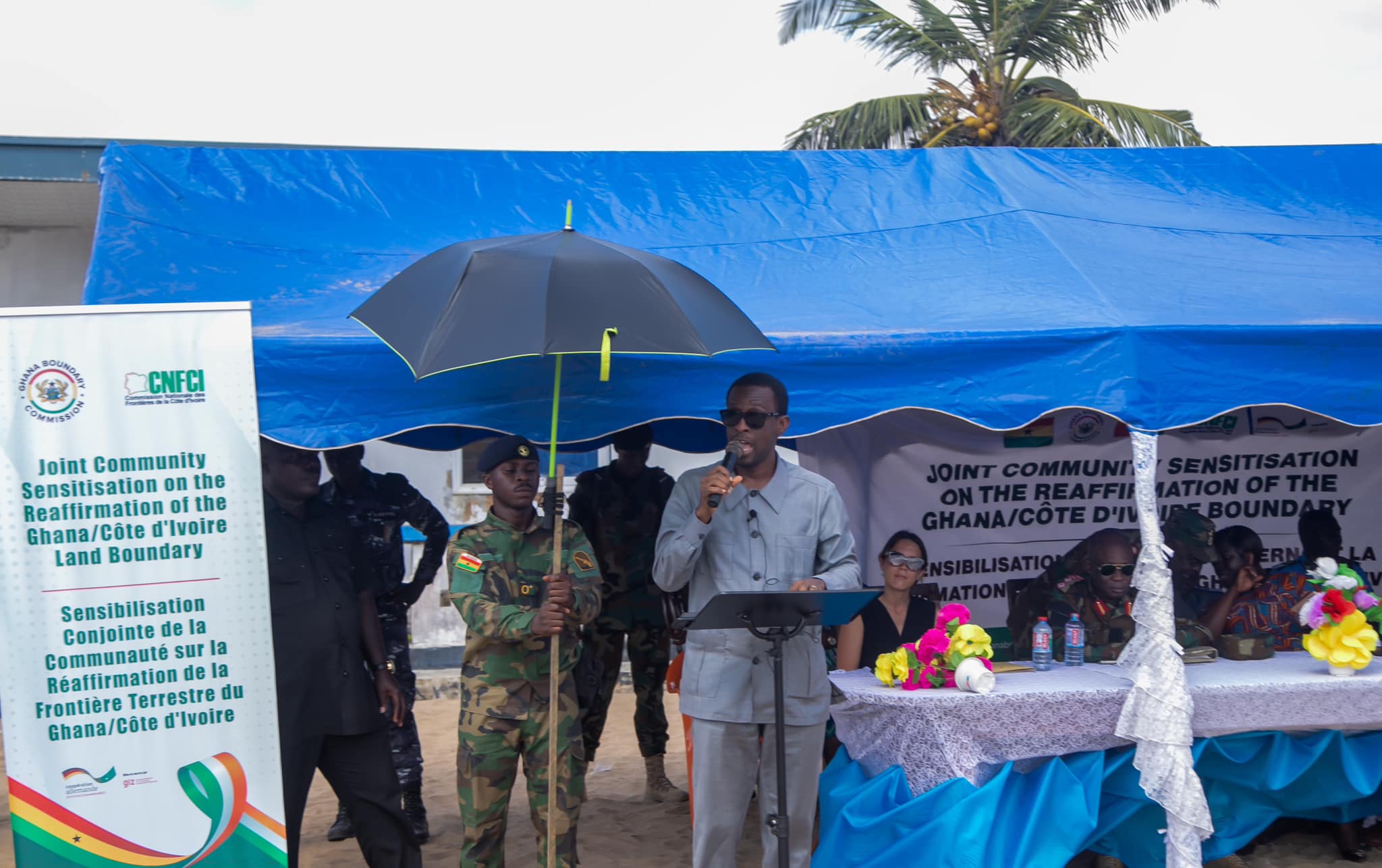 Dignitaries that participated in the joint community sensitisation included: Hon Kwabena Okyere Darko-Mensah, Western Regional Minister; Hon Louisa Iris Arde, Jomoro Municipal Chief Executive; Mr. Legre Koukougnon, Prefet for South Comoé district in Côte d’Ivoire; Ms Pauline Okkens, Political Adviser and Representative of the Germany Ambassador to Ghana; and Ms Nina Nick, Representative from the GIZ/AUBP in Addis Ababa, Ethiopia. Also in attendance were Senior Members of the Municipal Security Council, senior security officers from Côte d’Ivoire, staff of the two Commissions and Media from both countries.