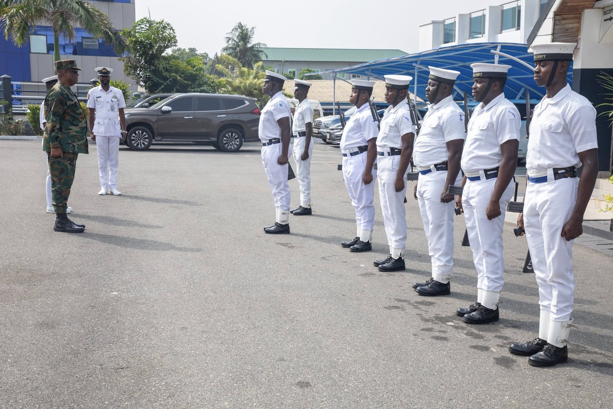 The Commissioner-General of the Ghana Boundary Commission (GhBC), Major General Anthony Ntem paid a working visit to the Naval Headquarters today. He was accompanied by some selected staff of the Commission. The aim of the visit was to congratulate the Chief of Naval Staff, Rear Admiral Godwin Bessing, on his appointment and also to hold discussions on some collaborative activities earmarked to be conducted in the year. On arrival at the Navy HQ, the Commissioner-General was received by the Chief Staff officer at the HQ after which he inspected a Quarter Guard.